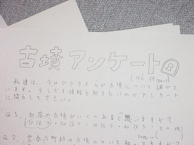 | 私達は、活動の中で、6年生と6年生の保護者の人にどれだけ知っているかをアンケートにして聞きました。内容は ・古墳はいくつと思うか? ・雲南六町村の古墳について知っているか? ・加茂の古墳の形を知っているか? ・古墳は大切なものだと思うか? ・古墳を残していきたいか? の5つのことを聞きました。 1問目の古墳はいくつかと思うか?子供は、古墳が10以下だと答えていました。大人も10以下が多かったです。 2問目の雲南六町村の古墳については、子供も大人も知っている人があまりいませんでした。 4問目の古墳は大切なものだと思うかは、子供も大人も大切なものだと思ってくれていました。その中で、墓だからという意見や貴重なものだからという意見がありました。5問目にこれからも古墳を残していきたいか?と聞いたら、子供も大人も残していきたいと思ってくれていました。 |