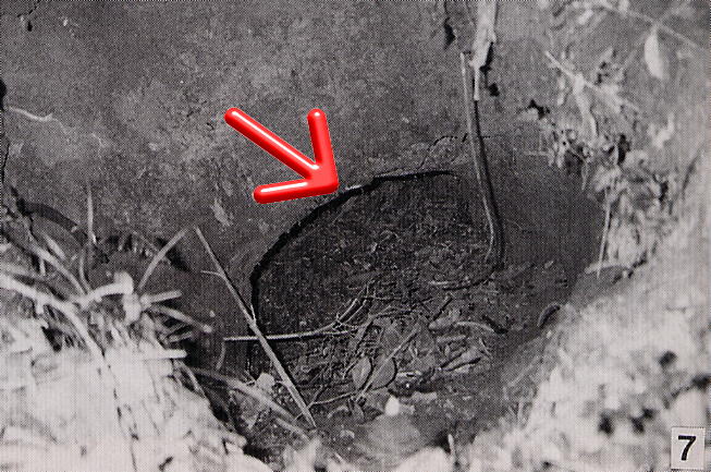 これが横穴墓です。ほら穴みたいなふうになっています。左側の写真の矢印のところに横穴墓があります。(星野横穴群) |