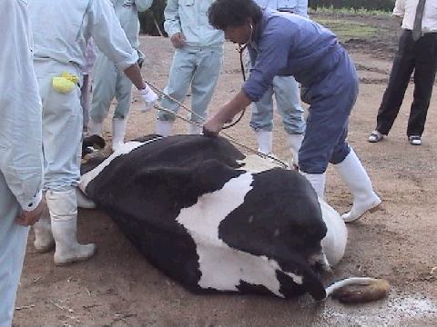 写真は、牛をひっくり返して胃をもどそうとしている写真です。