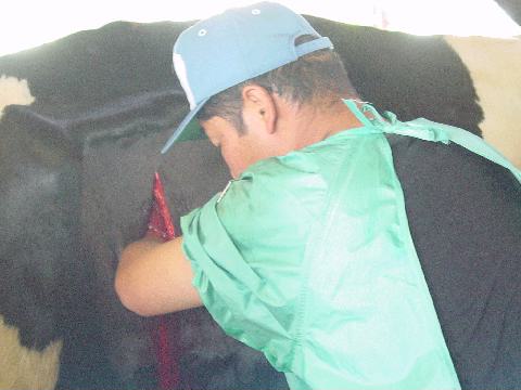 写真は、母牛の横腹をメスで切って手を入れて手術をしているところです。